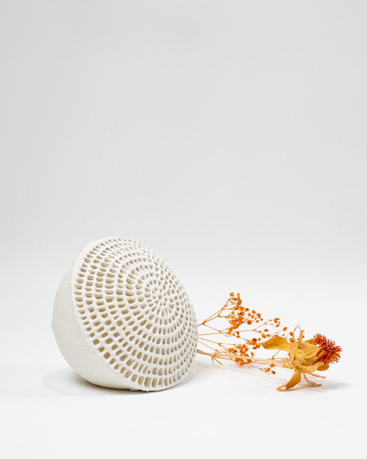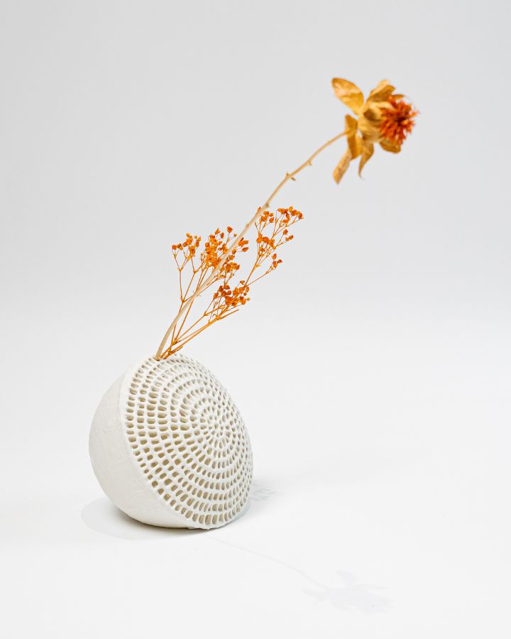 STABILO accoglie e sostiene con delicatezza fiori secchi o elementi botanici, trasformandoli in una composizione scultorea. Ideale come vaso di design per interni, trova la sua armonia su ripiani essenziali, mensole, consolle o tavoli da appoggio, dove diventa un punto focale di eleganza e silenzio.